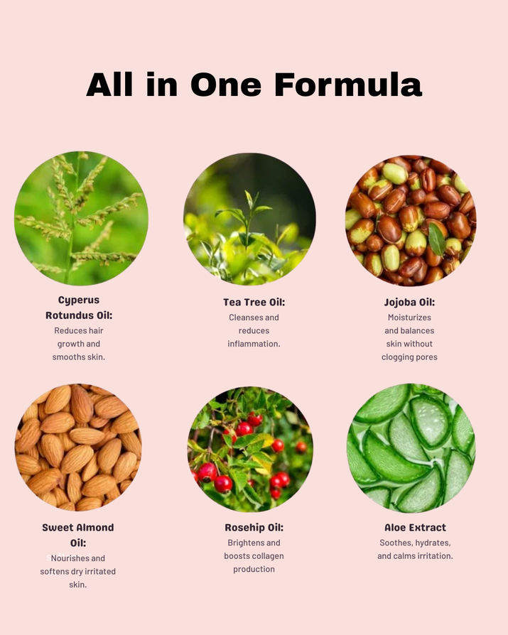 Experience smooth, hair-free skin naturally with our unique oil formulated to gently and effectively remove unwanted hair while nourishing your skin.